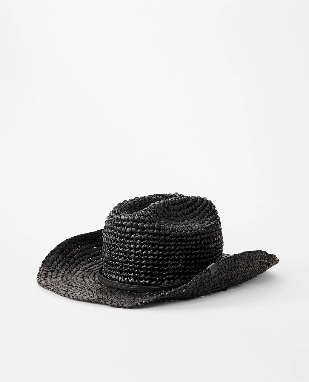 Embrace your inner cowgirl with this stylish straw hat. Featuring a chic crochet weave, this hat is crushable for easy packing. The leather-look thonging chin strap with stopper adds an extra touch of rugged elegance, making it a perfect accessory for those wild beach adventures.