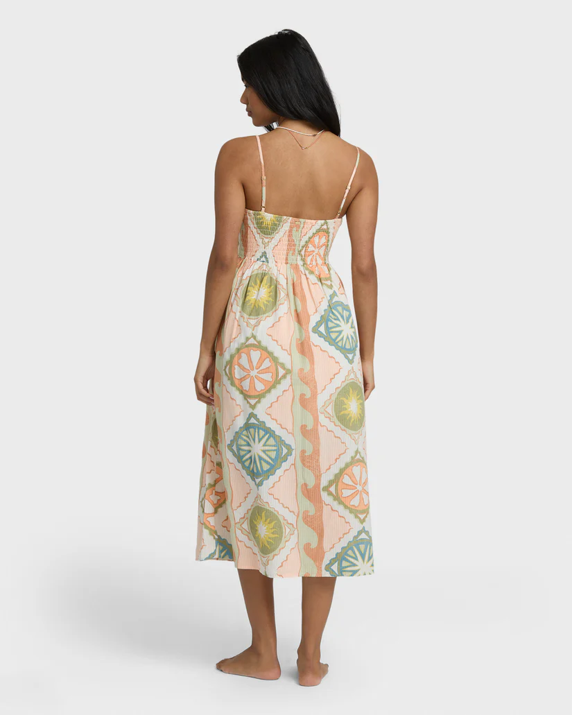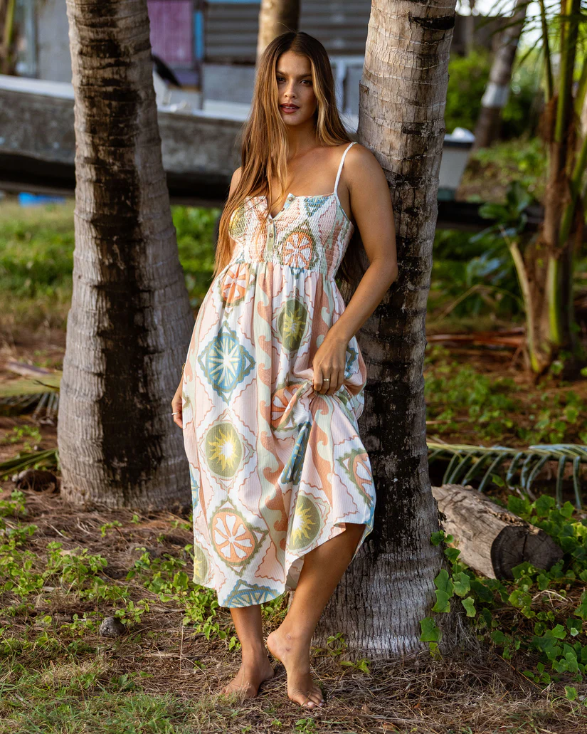 Step into summer in our Fever Dream Midi Dress, featuring a fitted smocked bodice and easy, flowy skirt. The 100% cotton stripe fabric keeps you cool, while the front button details add just the right touch of style. Perfect for sunny days or warm nights at 48 inches from shoulder to hem. Part of the Billabong Des Tropiques Collection — a sun-soaked escape of effortless layers and island accents, capturing that forever-on-holiday feeling.