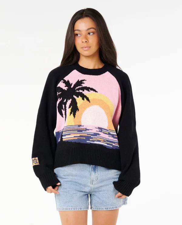 Bring tropical vibes to cooler days with the Paradise Knit Crew Fleece, featuring a vibrant sunset scene with palm trees and ocean waves. Soft and cozy with a clean black back, it’s the perfect blend of comfort and surf-inspired style.