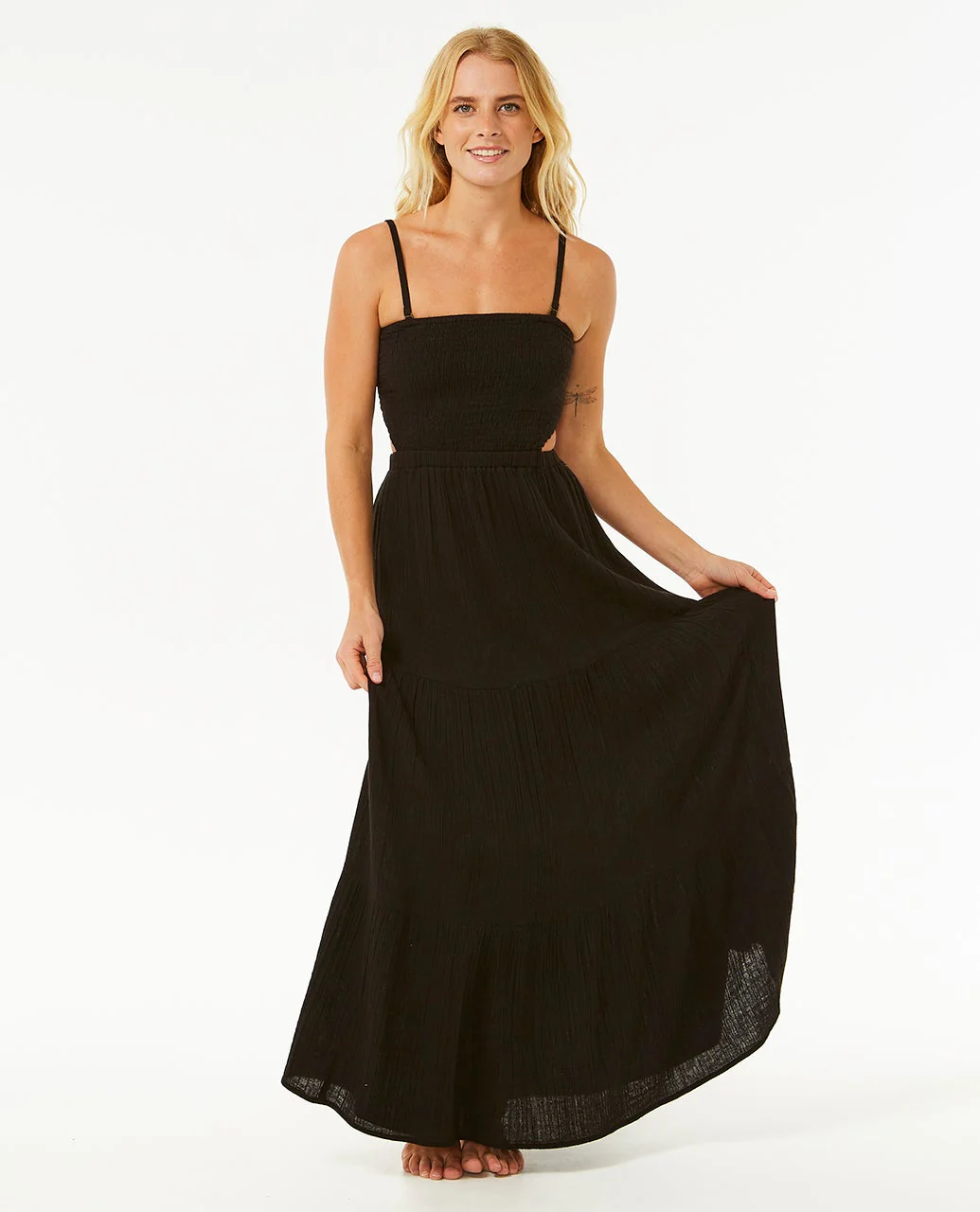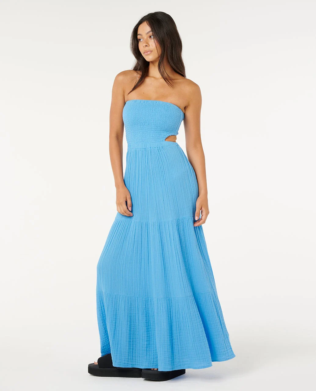 Make A Statement With The Premium Surf Maxi Dress. This Maxi Dress Features Metal Logo Trim, Shirring Detail, Removable Straps, Offering A Stylish And Comfortable Option For Your Summer Events.
