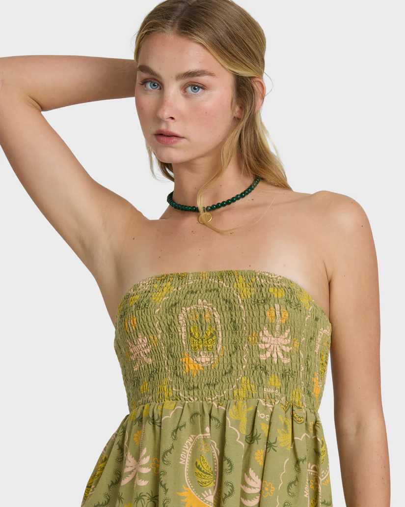 Summer vibes come alive in our Tropical Haze Mini Dress. The smocked bodice creates a flattering fit while the easy skirt offers breezy movement. Crafted from a soft viscose-cotton blend with a touch of flax, this mini dress keeps you cool and stylish. Part of the Billabong Des Tropiques Collection — a sun-soaked escape of effortless layers and island accents, capturing that forever-on-holiday feeling.
